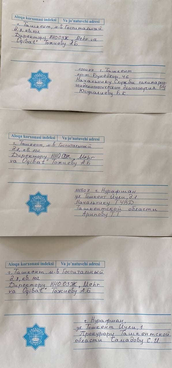 Со стороны ОЗЖ были незамедлительно отправлены заявления начальнику УВД и прокурору Ташкентской области, а также начальнику Службы санитарно-эпидемиологического благополучия и общественного здоровья, для прекращения этого противозаконного вида деятельности.