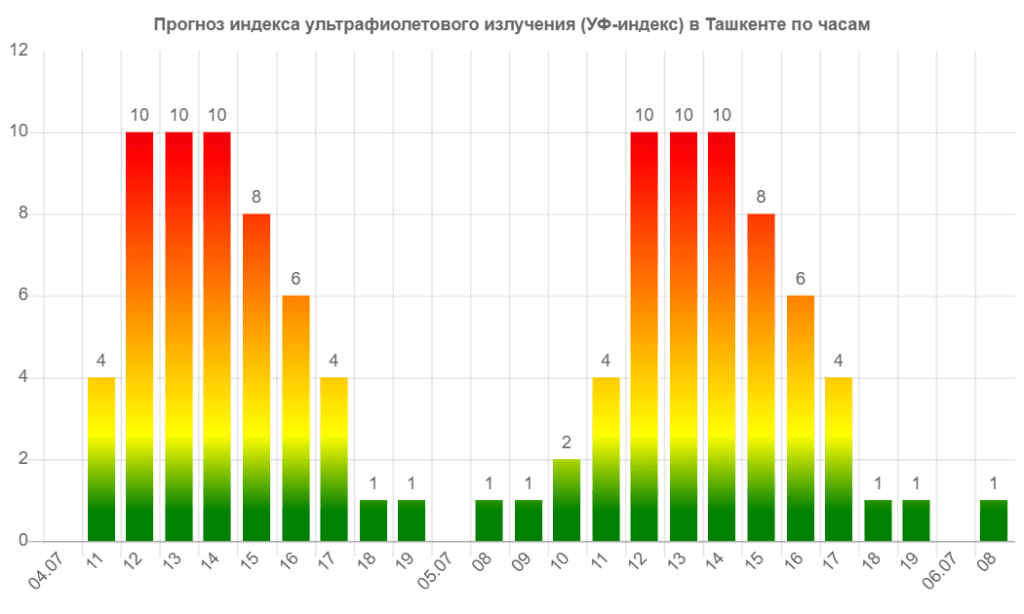 4 и 5 июля в Ташкенте ожидается УФ-излучение экстремального класса опасность. Об этом говорится в данных Meteonova.