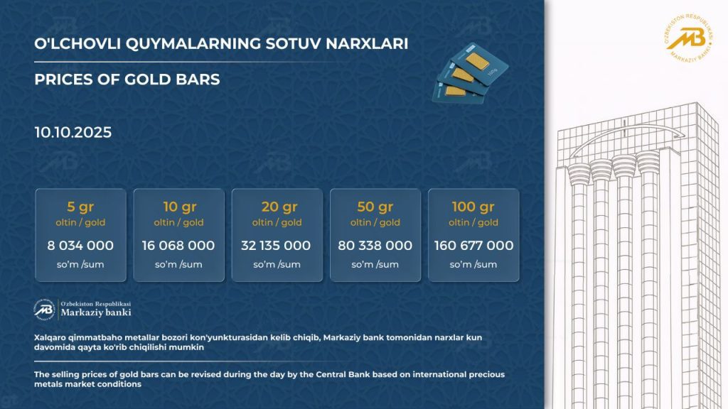 ЦБ также обновил стоимость золотых мерных слитков на 10 октября: согласно данным, 1 грамм золота от ЦБ Узбекистана стоит — 1 606 770 сумов. Ниже представлены котировки мерных слитков: