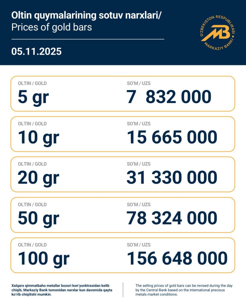 ЦБ также обновил стоимость золотых мерных слитков на 5 ноября: согласно данным, 1 грамм золота от ЦБ Узбекистана стоит — 1 597 450 сумов. Ниже представлены котировки мерных слитков: