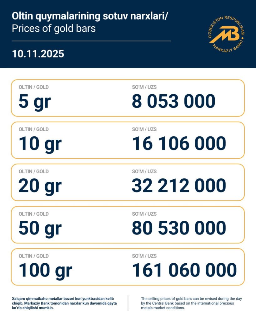 ЦБ также обновил стоимость золотых мерных слитков на 10 ноября: согласно данным, 1 грамм золота от ЦБ Узбекистана стоит — 1 580 300 сумов. Ниже представлены котировки мерных слитков: