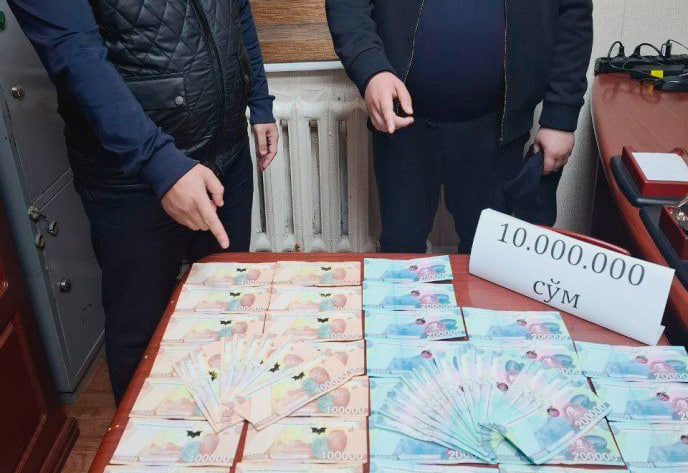 Подозреваемые проводили проверку на семейном предприятии, занимающемся производством окон и дверей. Они заявили о якобы заниженной уплате налогов и потребовали 10 млн сумов за то, чтобы не применять штрафные санкции. Ответственных сотрудников задержали с поличным во время получения вышеназванной суммы.