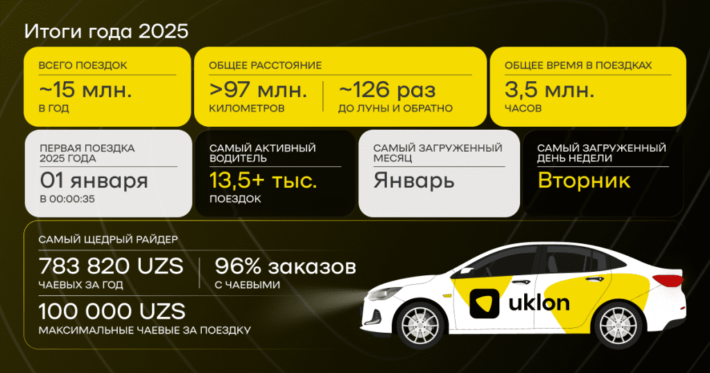 Каждый год — это тысячи историй, которые начинаются с одного нажатия кнопки «Заказать». Кто-то спешит сразу после боя курантов, кто-то проезжает тысячи километров за рулем, а кто-то благодарит водителей так, что это становится рекордом года. Для Uklon важно, чтобы каждая поездка была удобной, надежной и подходила конкретному человеку — с его маршрутом, темпом жизни и планами на день. Именно таким сервис мы продолжаем развивать в Узбекистане, — отмечает вице-президент по экспансии Uklon Максим Остапюк.