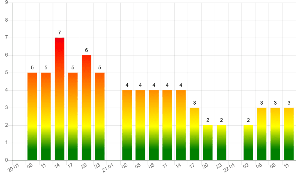 Сила геомагнитных возмущений составит 7 баллов. Геоудары начались с 5 баллов в 08:00 после чего показатель увеличится до 7 баллов. Сила солнечных ударов снизится до 3 баллов только к вечеру 21 января.