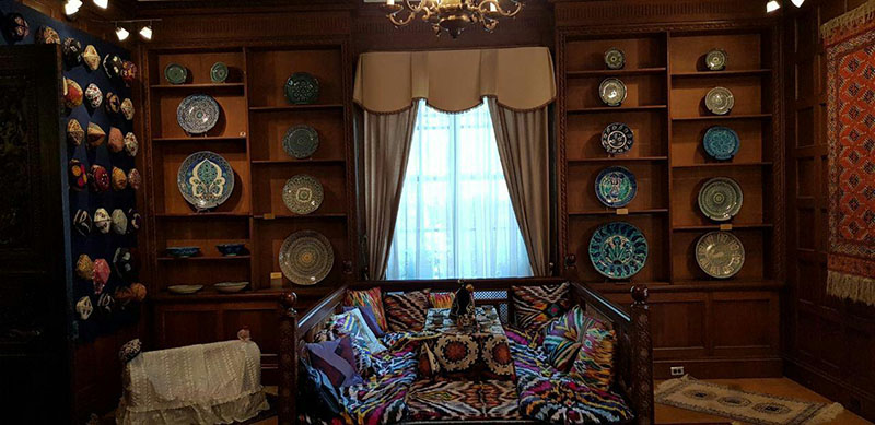 - На первом этаже расположены залы «Самарканд», «Бухара», «Хива» и «Коканд» для переговоров, деловых и культурных мероприятий. Айван у входа в посольство отражает национальные традиции и богатую самобытную культуру узбекского народа.