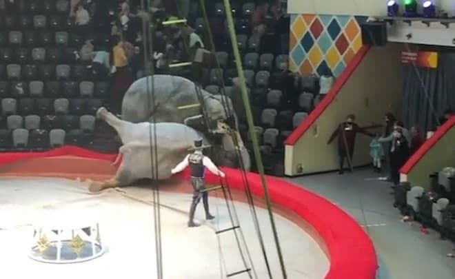 В Казани во время представления «Шоу слонов и магия цирка» один слон напал на другого и повалил его на борт манежа. Отмечается, что зрители успели покинуть свои места.