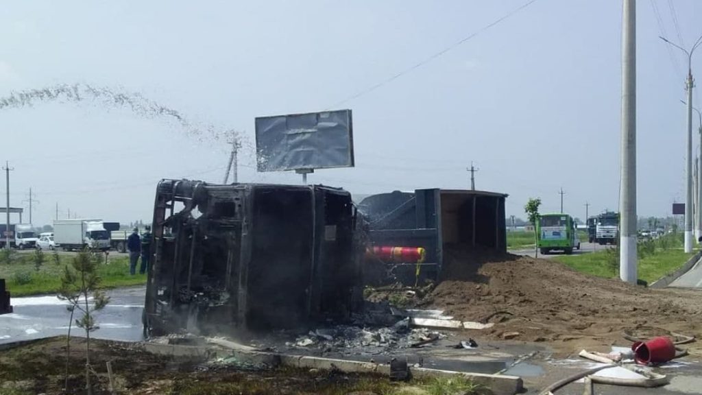 В Янгихаётском районе Ташкента перевернулся и загорелся грузовик, сообщает пресс-служба ГУБДД.