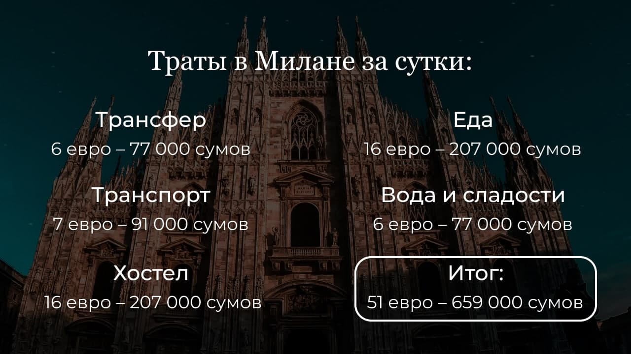 Всего в Милане за сутки мы потратили 51 евро (659,000 сумов), но в этом городе Италии мы практически не тратились, не покупали какие-то предметы одежды или сувениры домой. Основной шоппинг у нас произошёл уже в других городах Италии, что весьма прозаично, ведь именно Милан — город шоппинга.