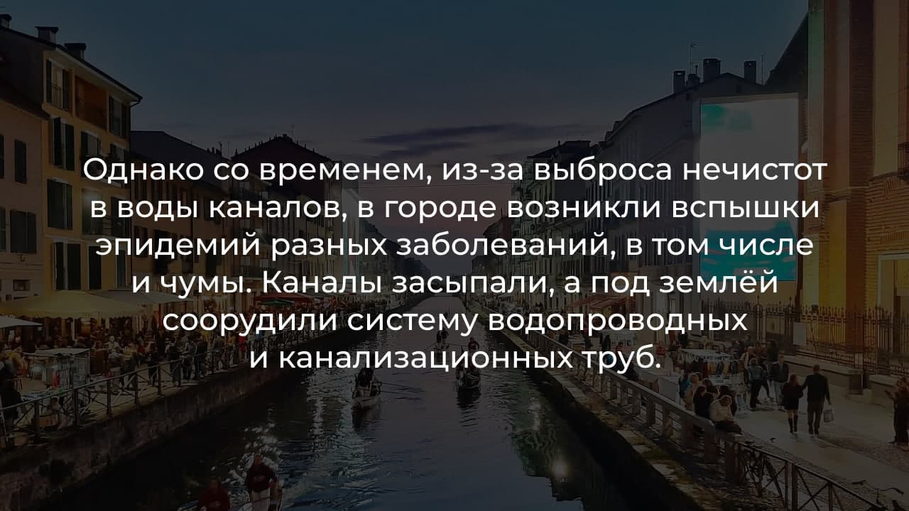 Одно из самых атмосферных мест Милана — каналы района Navigli. В Средневековье Милан был изрезан 124 каналами, которые простирались на 150 километров. Милан был больше похож на величественную Венецию. Миланские каналы были водными путями до XIX века, созданные человеком для транспортировки древесины, угля, тканей, вина, мяса и других товаров для продажи в другие регионы.