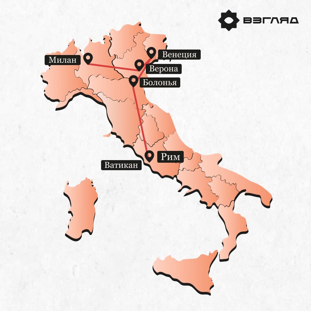 Перед тем, как вылететь в Италию, мы открыли её карту и пытались составить наиболее выгодный маршрут поездок. Первым делом мы приземлились в Милане, затем поехали в Верону, потом в Венецию, ночью погуляли по Болонье и закончили итальянские каникулы в Риме и Ватикане.