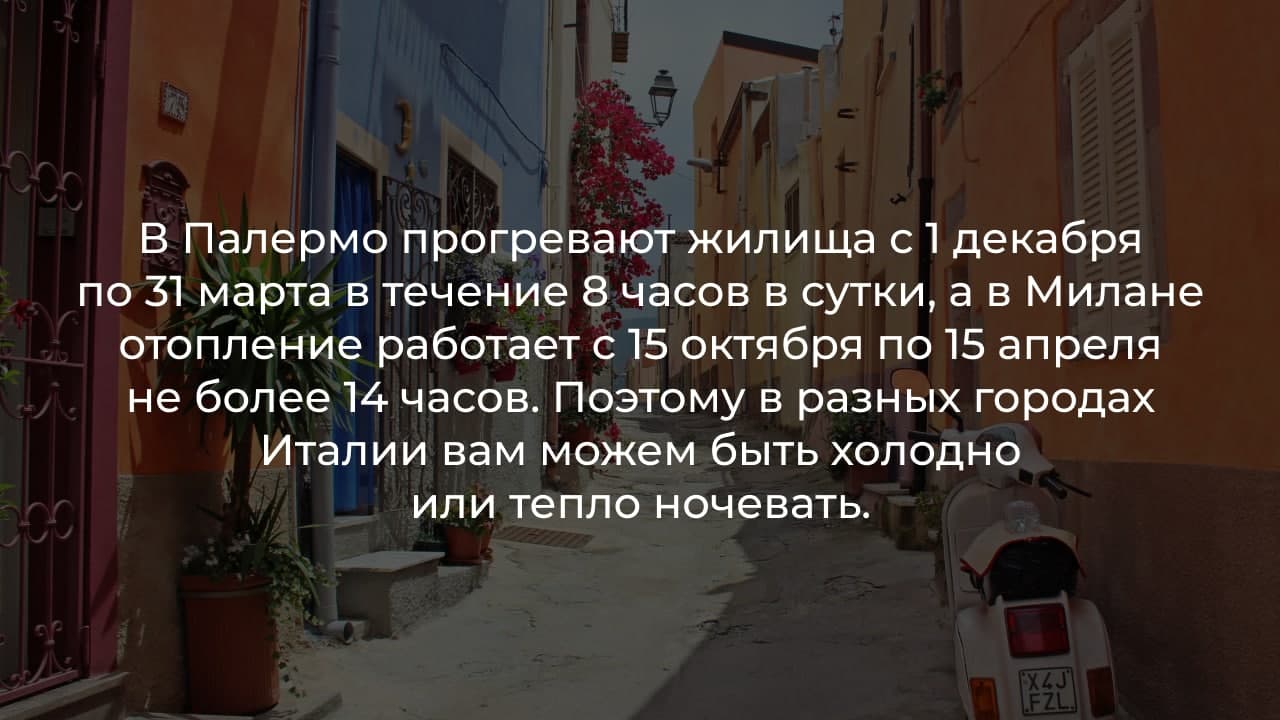 В Италии мы столкнулись с проблемой отопления. Дело в том, что работает оно неравномерно. Страна поделена на шесть климатических зон по средним показателям температуры. Существует закон, согласно которому любой итальянец, который нагрел воздух в своей квартире выше 22 градусов, должен быть оштрафован. Для каждой из зон прописано конкретное количество часов в сутки, во время которых позволяется включать батареи.