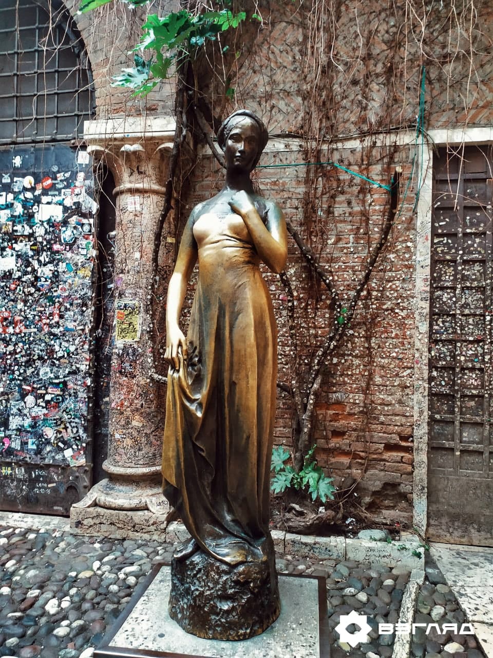 Здесь очень много туристов, как иностранных, так и самих итальянцев. Тут также стоит статуя Джульетты, возле которой все фоткаются и норовят потрогать бедную 14-летнюю Шекспировскую героиню за грудь на счастье и посмеяться на камеру. Особенно забавно смотреть на это, когда помнишь, каким образом закончила Джульетта в оригинальной пьесе.