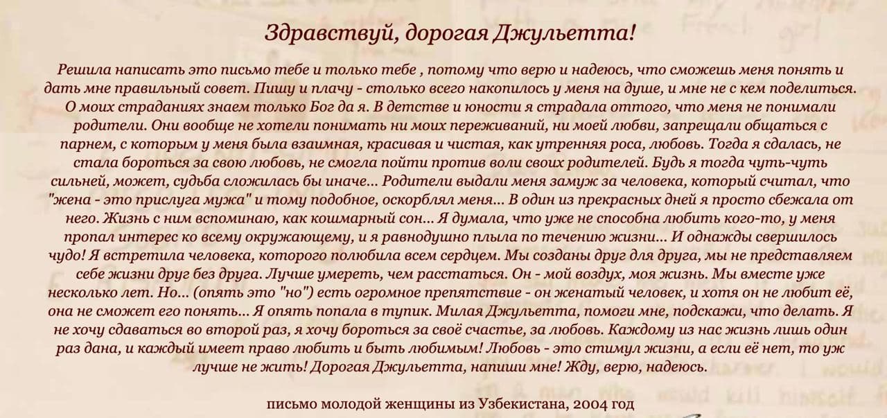 На сайте Джульетты есть письма многолетней давности. Одно из таких писем пришло в Клуб Джульетты из Узбекистана.