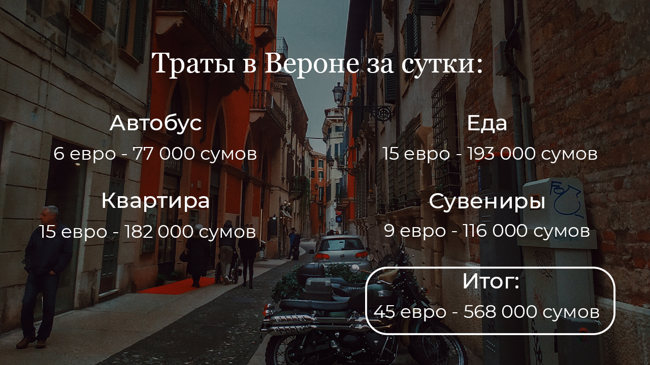 Всего в Вероне за сутки мы потратили 45 евро (568,000 сумов), что на 6 евро меньше, чем в Милане. Здесь мы уже начали приобретать сувениры и магниты домой, а также попробовали настоящую итальянскую пиццу и пасту.