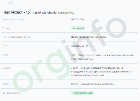Тухташев Фарход Фармонович является руководителем компании OOO «GEO PROEKT KAD», которая зарегистрирована в Нарпайском районе Самаркандской области и занимается, по документам, «пресноводным рыболовством».