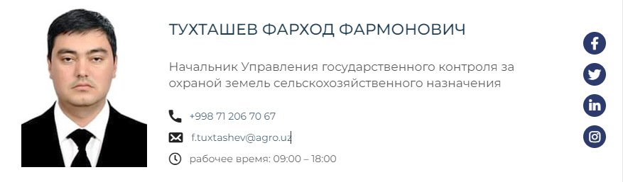 Согласно данным Orginfo.uz, начальник Управления государственного контроля за охраной земель сельскохозяйственного назначения в Министерстве сельского хозяйства владеет компанией.