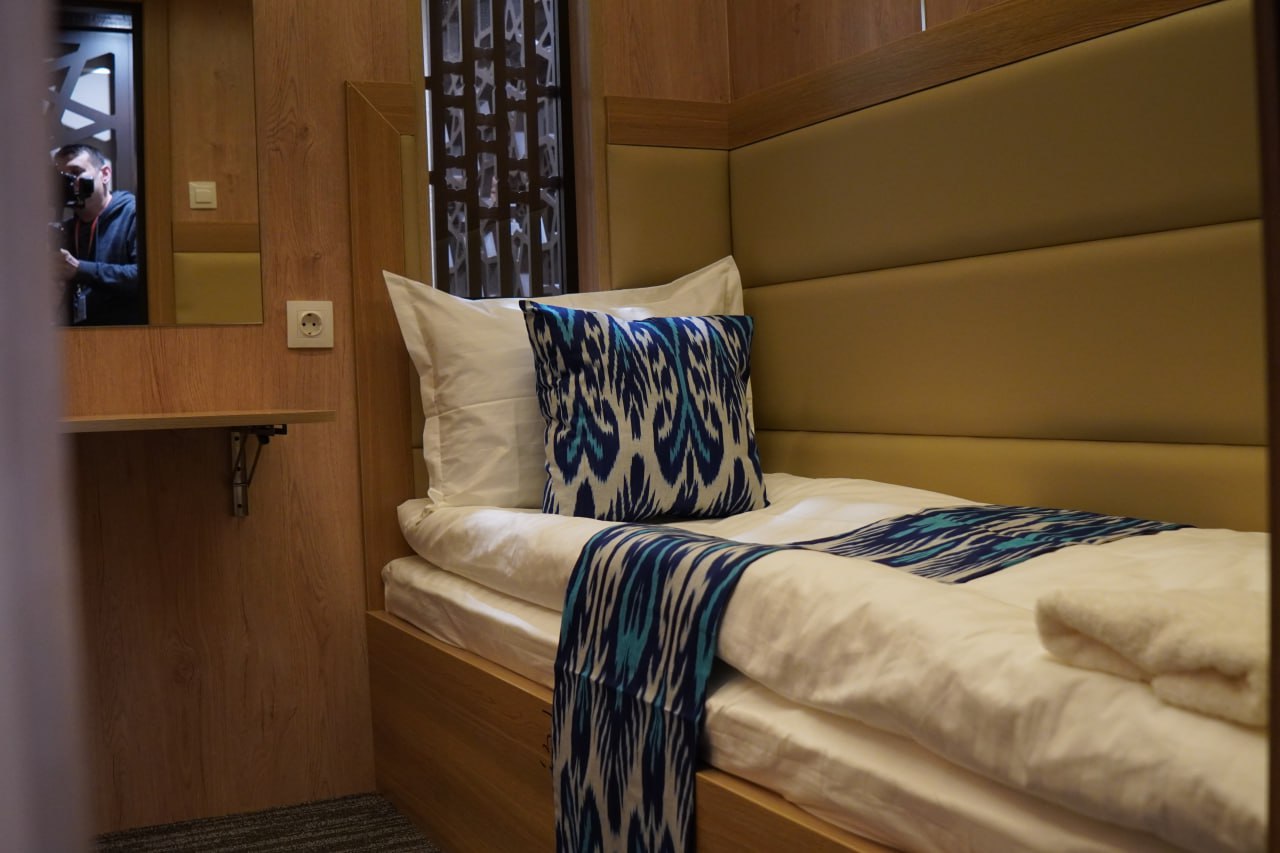 «Аэропорт столицы на глазах превращается в современный международный хаб, и я очень рад внести свою скромную лепту в его преображение. Наш проект выполнен в совершенно другом стиле, нежели подобные отели во многих аэропортах мира. Мы постарались передать аутентичность и роскошь Востока, а в самих капсулах сохранить европейский минимализм и компактность. К сожалению, не каждый трансферный пассажир может задержаться в Узбекистане и посмотреть древние города и культуру. Поэтому нашей целью было создать аутентичную атмосферу прямо в аэропорту», — отметил художник Бобур Исмаилов.