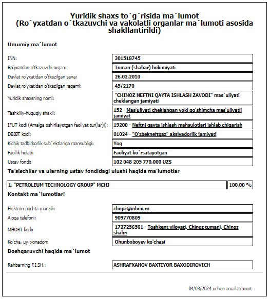 До этого Чиназский НПЗ принадлежал государственной компании «Узбекнефтегаз». Предприятие было запущено в августе 2016 года, оно может ежегодно перерабатывать до 117 тысяч тонн нефти в бензин, керосин, дизтопливо, мазут и смазочные масла. Завод был выставлен на приватизацию в ноябре 2022 года.