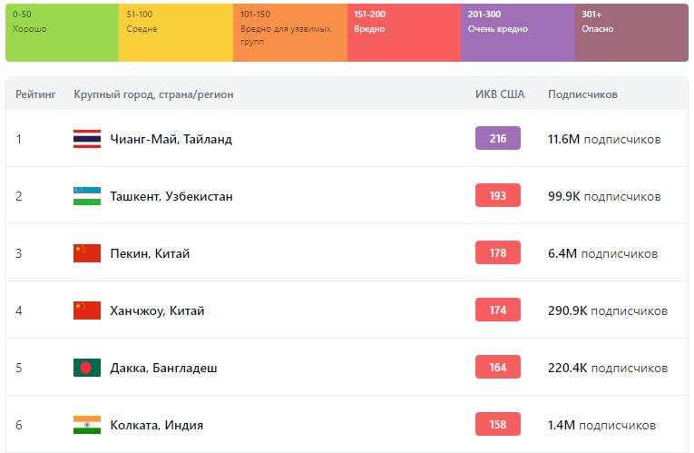 Ташкент поднялся на 2-е место среди крупнейших городов мира по уровню загрязнения воздуха. Текущая ситуация в 14,8 раз превышает средний показатель качества воздуха, рекомендованный ВОЗ.