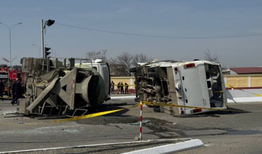 На перекрёстке не работал светофор. Бетономешалка двигалась по главной дороге, автобус со школьниками в этом время пересекал перекрёсток, и грузовик врезался в него.