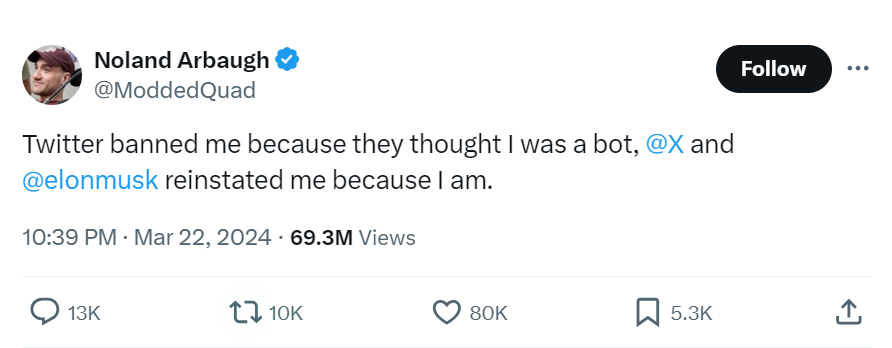 «Twitter заблокировал меня, потому что думал, что я бот, но X и Илон Маск восстановили меня, потому что это так», — написал парализованный Ноланд Арбо.