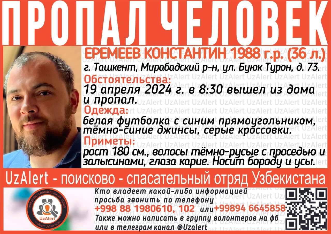 Константин проживал в Мирабадском районе Ташкента и вышел из подъезда в 08:30. Как уточняют родственники пропавшего, в тот день он направлялся в филиал своей кофейни по адресу: улица Бобура, 73Б.