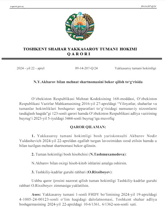 22 апреля 2024 года по решению хокима Яккасарайского района Нилуфар Аллабергеновой трудовой договор с Надиром Акбаровым был расторгнут в связи с его смертью.