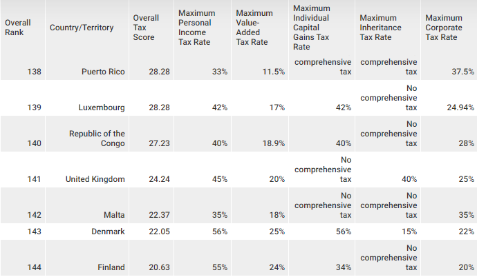 Самые «жесткие» налоги, судя по рейтингу, в Финляндии и Дании, где ставка налога на личный доход находится в районе 55-56%, а НДС — 24-25%.