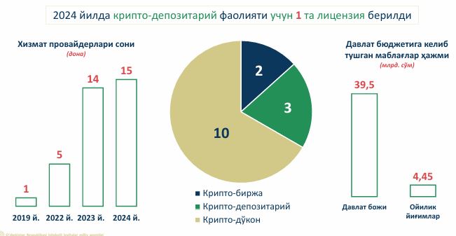 С 2022 года поступления в госбюджет за счет сборов, уплачиваемых участниками оборота крипто-активов, превысили 44 млрд сумов. В отрасли было создано минимум 72 новых рабочих места.