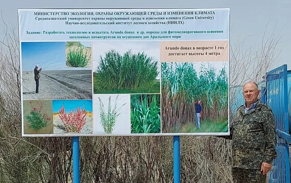 «Это новые растения для осушенного дна Арала, интродуцированные с других зон. Через 1-2 года вся эта площадь будет засажена растениями Arundo donax, потому что корневые отпрыски дают ростки. Они не только помогут предотвратить ветры с солью, но их стебли можно использовать для строительства, плетения и кормовой продукции», – говорит Новицкий.