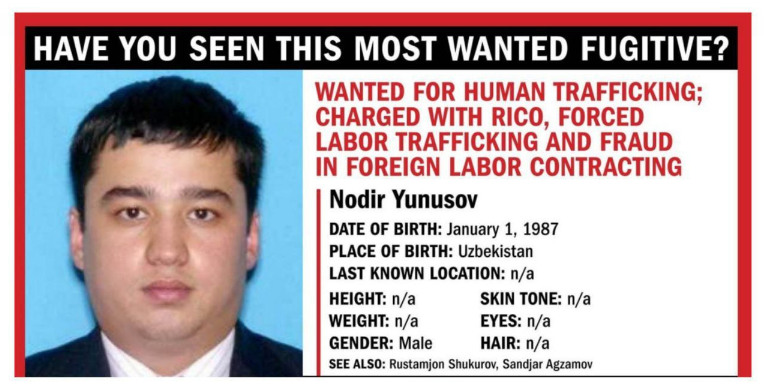 Согласно информации, США и Интерпол разыскивают его в связи с особо тяжкими преступлениями: торговлей людьми, рабскому труду, мошенничеству, рэкетирству и созданию коррумпированной организации. По данным ФБР, в 2005-2009 годах, он совместно с другими узбекистанцами, взял в рабство 59 человек, из которых спасли 40. Глава организации Аброрходжа Аскарходжаев был арестован, а Нодир Юнусов с подельниками бежал на родину.