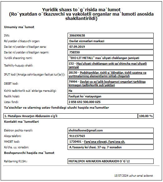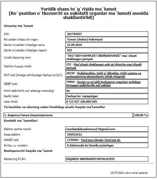 Анваржон Абдурахимович Муталипов, который считается руководителем и единственным учредителем резервного победителя ООО «ЭКО ЛИТ МЕТАЛЛ», возможно, в 2021 году владел 50% ООО «EKO TSEM KOMPLEKT OBORUDOVANIE». Кроме того, на личных страницах руководителей и основателей вышеупомянутых компаний в социальных сетях появились предположения о том, что они могут быть близкими родственниками. На данный момент руководителем ООО «EKO TSEM KOMPLEKT OBORUDOVANIE» является Аскаров Абдурахим Муталович. Есть подозрения, что он является отцом Муталипова Анваржона Абдурахимовича, которому фамилия досталась по имени деда.