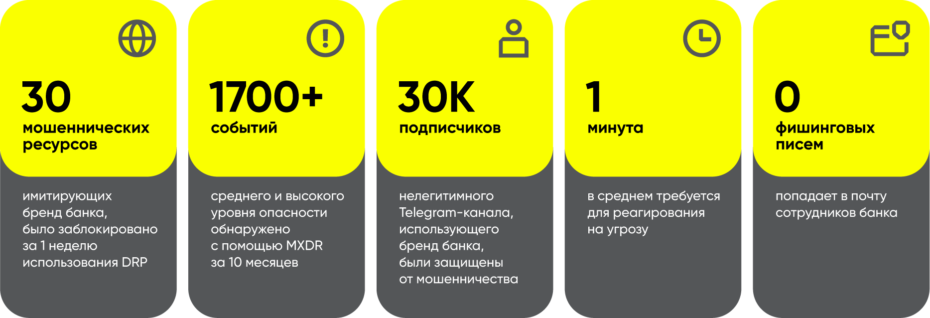 Устранение угрозы фишинга и скама. Благодаря внедрению MXDR банку удалось свести количество фишинговых писем к нулю. А с помощью решения Digital Risk Protection (DRP) AVO bank выявляет и блокирует 90% мошеннических ресурсов. Благодаря решениям Group-IB банк выявляет и устраняет угрозы, которые не удавалось обнаружить раньше, например, мошеннические каналы в Telegram. С помощью Group-IB банк также оперативно выявляет и блокирует фишинговые атаки, нацеленные на топ-менеджмент компании.