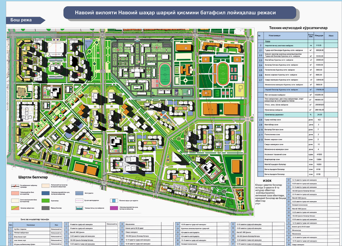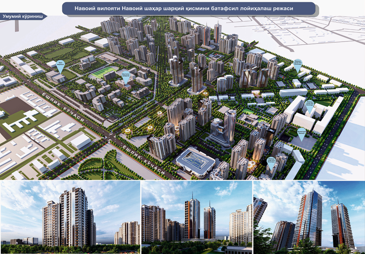 «На этом земельном участке планируется поэтапно построить город Новый Навои и парк „Новый Узбекистан“. Город представляет собой инфраструктуру, состоящую из крупных современных коммерческих и жилых зданий, в том числе парка „Новый Узбекистан“ и аллеи для культурного отдыха, новых зданий Навоийского государственного педагогического института (кампусного типа) и других социальных объектов, высотных жилых домов, объектов предпринимательства и предприятия, бытовые услуги, а также строительство объектов бытового обслуживания. Также будут построены библиотека, искусственное озеро и ремесленные мастерские», — рассказал он.
