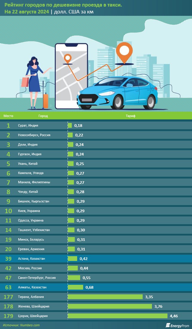 Среди городов СНГ самый высокий тариф на такси был зафиксирован в Алматы — 0,68 доллара США за километр (63-е место в мире из 179). В столице Казахстана, Астане, стоимость поездки составила 0,42 доллара (39-е место в мировом рейтинге), в Москве и Санкт-Петербурге — 0,44 и 0,55 доллара соответственно.
