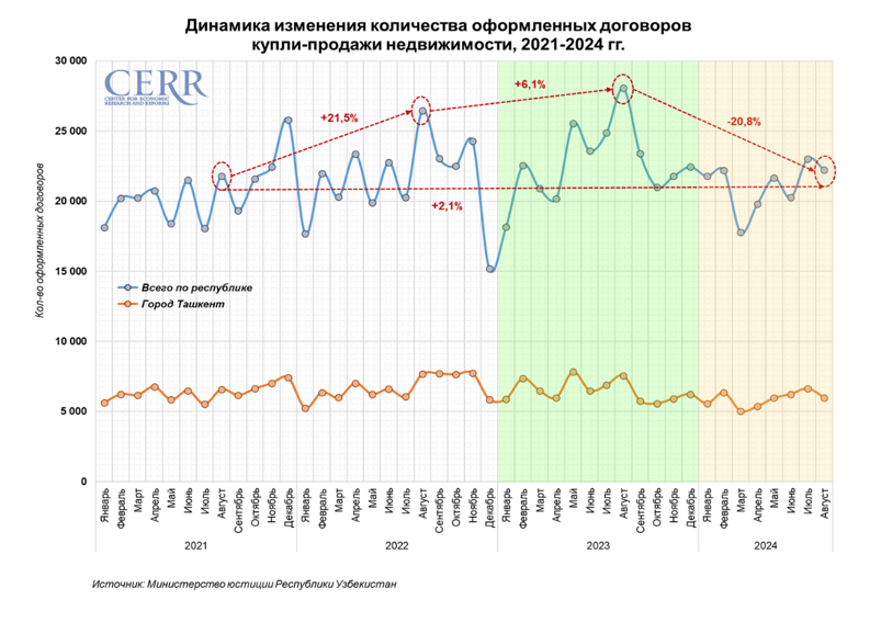 В августе 2024 года наибольшее снижение операций с недвижимостью было отмечено в Сырдарьинской (22,6%), Хорезмской (13,2%) областях и в городе Ташкенте (9,7%).