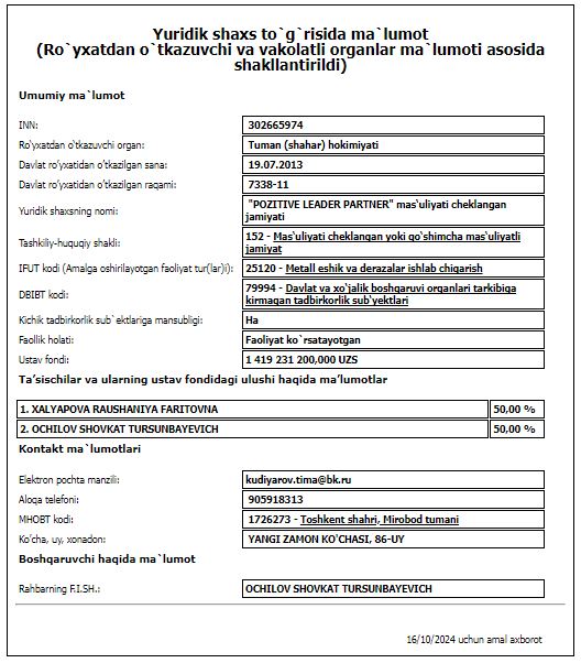 Согласно данным Единого государственного реестра предприятий и организаций (ЕГРПО), «POZITIVE LEADER PARTNER» была зарегистрирована в июле 2013 года в Мирабадском районе Ташкента. Однако на сайте компании указано, что она работает на рынке Узбекистана с 2002 года. Уставный капитал составляет почти полтора миллиарда сумов.