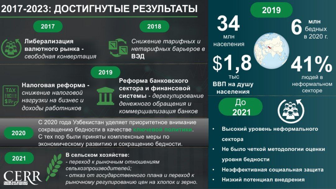 С 2017 года Узбекистан начал масштабные реформы, направленные на повышение конкурентоспособности страны. Эти преобразования включали экономические реформы, которые способствовали росту и стабильности, а также меры, направленные на сокращение бедности и обеспечение того, чтобы выгоды развития доходили до всех слоев общества.
