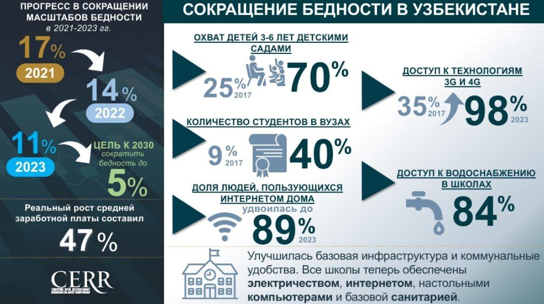 С начала 2021 года уровень бедности в Узбекистане снизился с 17% до 11%, что является значительным шагом на пути к цели сократить бедность до 5% к 2030 году. Это снижение стало возможным благодаря системным реформам в экономике и социальной политике страны.