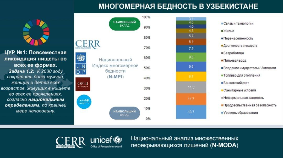 Важным шагом в борьбе с бедностью стало признание концепции многомерной бедности. Национальный индекс многомерной бедности (MPI), разработанный при поддержке ПРООН, Оксфордской инициативы по проблемам бедности и ЮНИСЕФ, показал, что основными факторами бедности в Узбекистане являются уровень образования (13,7%), продовольственная безопасность (11,7%) и неформальная занятость (11,5%).