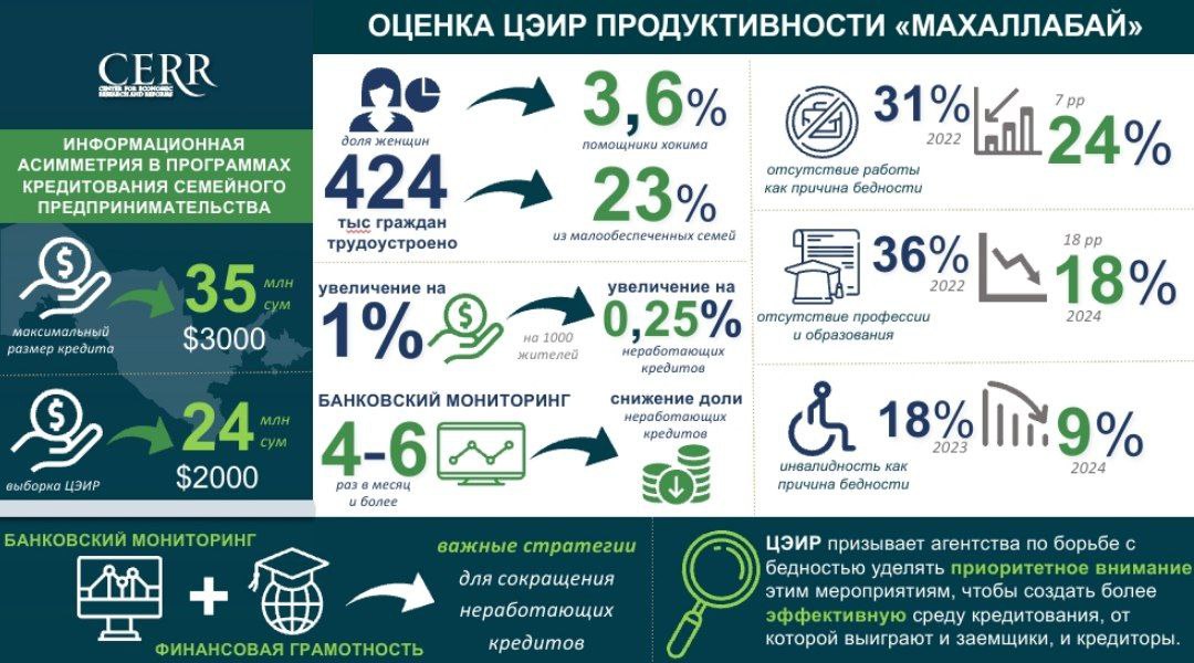 В рамках программы «Махаллабай» 7,9% выданных кредитов были классифицированы как невозвратные. В период с 2022 по 2023 год благодаря деятельности помощников хокимов было трудоустроено 424 тысячи граждан, из которых 23% принадлежат к семьям с низким уровнем дохода.