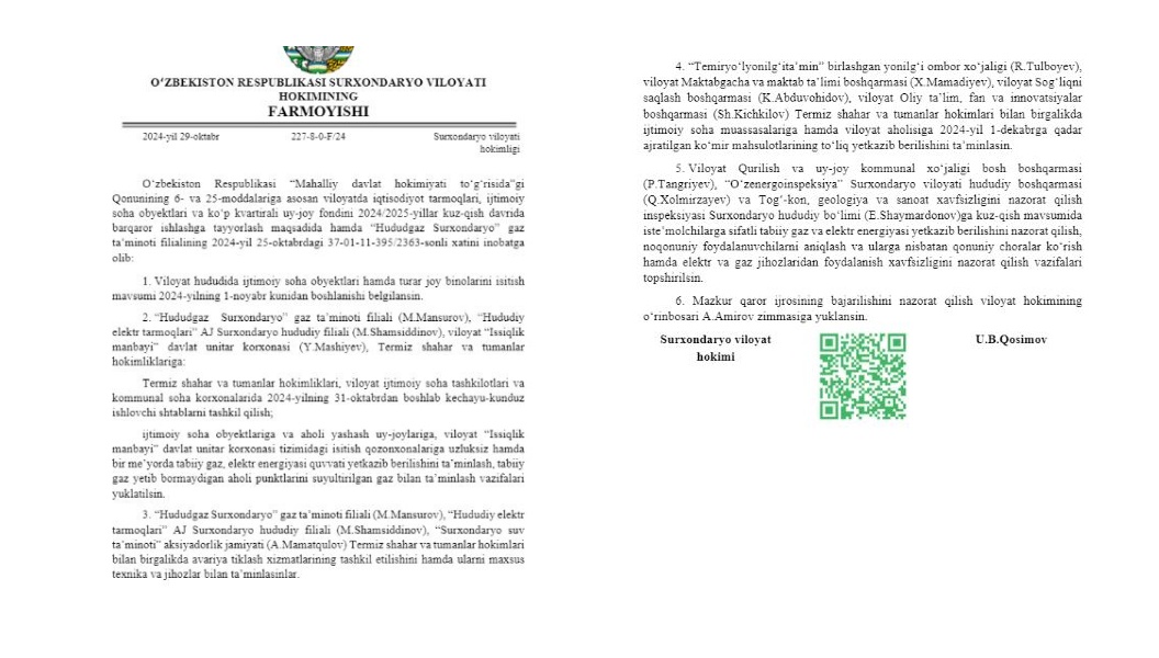 С 1 ноября в социальных учреждениях и жилых домах Сурхандарьинской области должно начаться отопление, согласно распоряжению хокима области Улугбека Косимова от 29 октября.