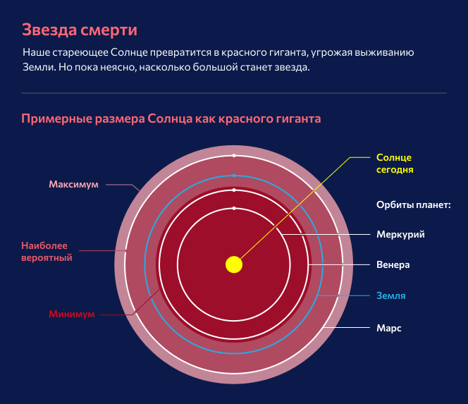 Это разрастающееся Солнце поглотит Меркурий и, возможно, Венеру, прежде чем достигнет орбиты Земли. Но оно может расшириться ещё больше.
