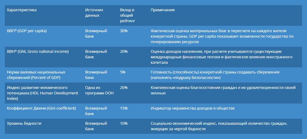 Индекс мирового процветания рассчитан на основе данных Всемирного банка и ООН по шести ключевым индикаторам: