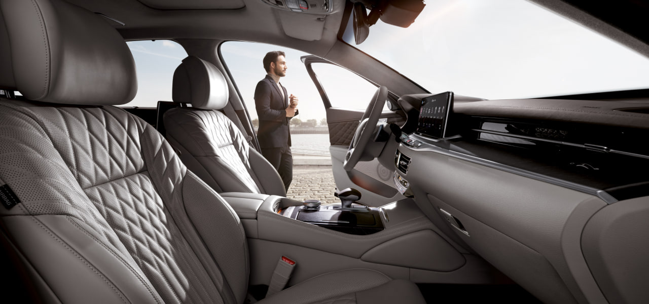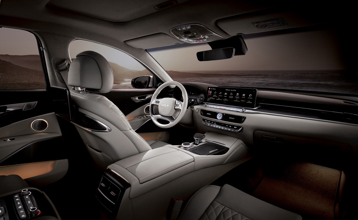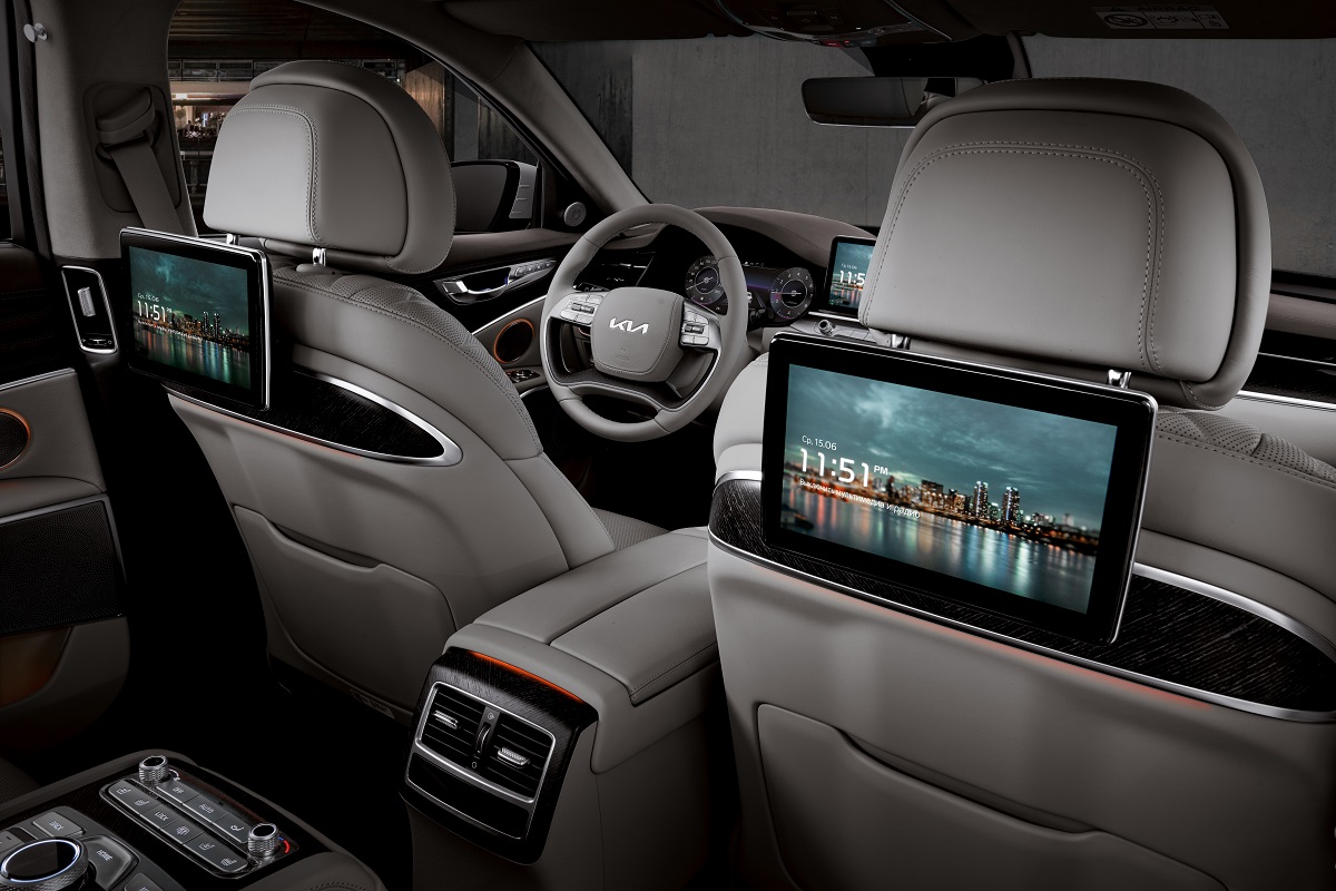 В просторном салоне – тоже всё с учетом «требований статуса». Царство дорогой кожи Nappa с элегантной прострочкой, мягких премиальных отделочных материалов, декоративных вставок из натурального дерева. Многочисленные изящные кнопки позволяют настроить под себя удобные кресла Ergo Motion каждому в салоне, а в центральный подлокотник второго ряда интегрирован блок управления системой климат-контроля и мультимедиа. Подогрев, вентиляция, массаж – конечно же! Отличная шумоизоляция двойных стекол, солнцезащитные шторки с электроприводами – всё, как «положение обязывает». При этом и здесь аккуратные штрихи не дадут ошибиться – это салон современного, высокотехнологичного автомобиля. Красивые контурная и «атмосферная» подсветки, дополнительные экраны для задних пассажиров в спинках передних сидений… Экран мультимедийной системы имеет большую диагональ – 14,5 дюймов – но вписан в интерьер очень со вкусом, без визуального доминирования. Аудиосистема оправдывает принадлежность к категории Hi-Fi: звук в салоне богат, объемен и естественен. В мультимедийной системе использовано одно из наиболее передовых решений – дополненная реальность, но управление системой реализовано «классически»: приятным на ощупь сенсорным диском, а не виртуальными кнопками. И это делает работу с ней приятнее. Даже в премиум-сегменте многие автомобили сейчас как будто хвастаются «технологичностью» интерьеров и кажутся от этого более отчужденными. Kia K9 предлагает идеальный баланс классики и современности. Высоких технологий в нем не меньше, но интерьер остается очень уютным.