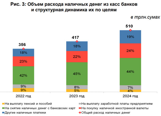 Одновременно с этим структура расходов наличных денег из касс банков демонстрирует увеличение общей суммы операций – с 356 трлн сумов в 2022 году до 510 трлн сумов в 2024 году. Основные статьи расхода остаются стабильными: крупнейшая доля приходится на снятие наличных с карт (около 44%), а также на выплаты заработных плат (24%) и покупку иностранной валюты (19%).