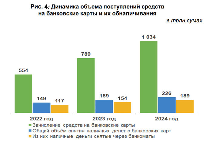Объём зачислений на карты увеличился с 554 трлн сумов в 2022 году до 1 034 трлн сумов в 2024 году, что отражает рост популярности безналичных расчётов. Однако объемы снятия наличных денег с карт также продолжают расти: с 149 трлн сумов в 2022 году до 226 трлн сумов в 2024 году.