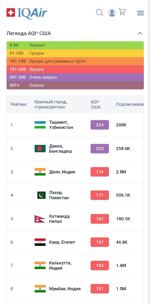 Вслед за Ташкентом расположилась Дакка (Бангладеш) с AQI 220, а третье место занял Дели (Индия), где AQI составил 174.