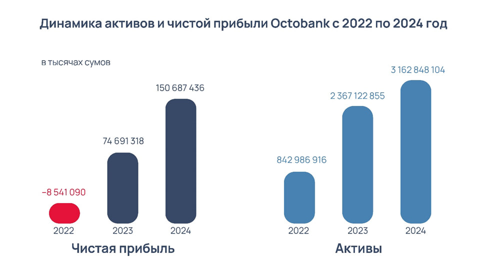 Чистая прибыль в 2024 году составила 150 млрд сумов, активы банка — 3,16 трлн сумов. Такие результаты подтверждают финансовую стабильность Octobank и эффективность управления ресурсами.