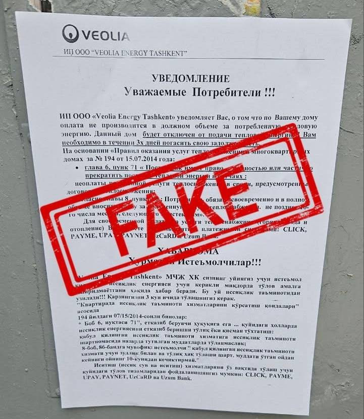 Veolia Energy Tashkent призвала граждан доверять только официальным источникам информации и не распространять непроверенные данные.